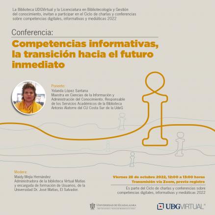 |Conferencista: Yolanda López Santana |Maestra en Ciencias de la Información y Administración del Conocimiento. Responsable de los Servicios Académicos de la Biblioteca Antonio Alatorre del CU Costa Sur de la UdeG |Modera: Maidy Mejía Hernández |Administradora de la biblioteca Virtual Matías y encargada de formación de Usuarios, de la Universidad Dr. José Matías, El Salvador. Transmisión vía zoom, previo registro: https://forms.gle/b7qh4rA3ikRkPNfJ7 Esta conferencia forma parte del Ciclo de charlas y conferencias sobre competencias digitales, informativas y mediáticas 2022.
