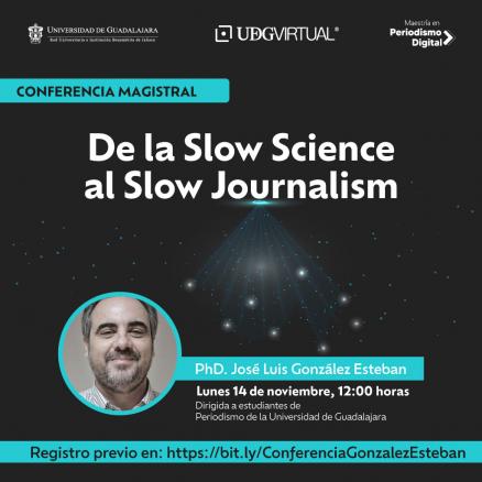 La Maestría en Periodismo Digital - UDGVirtual invita a la conferencia magistral "De la Slow Science al Slow Journalism", a cargo del PhD. José Luis González Esteban , profesor investigador en periodismo y comunicación política de la UMH Universidad Miguel Hernández |Lunes 14 de noviembre, 12:00 horas, vía Zoom |Dirigido a estudiantes de periodismo de la Universidad de Guadalajara, CUSur, Centro Universitario de la Ciénega UdeG, CULagos, SUV |Se otorgará constancia de participación. Registro previo en: https://bit.ly/3hAowtf