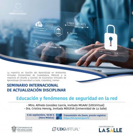 La maestría en Gestión del Aprendizaje en Ambientes virtuales invita a la videoconferencia: Educación y fenómenos de seguridad en la red |Ponentes: Mtro. Alfredo González y la Dra. Cristina Hennig |8 de septiembre, de 18:30 h (Hora México) |Registro: https://bit.ly/semgaav12