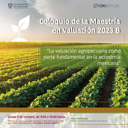 #Agenda el Coloquio de la Maestría en valuación 2023 B “La valuación agropecuaria como parte fundamental en la economía mexicana” 9 de octubre 2023, de 9:00 a 19:00 horas Presencial salas 1 y 2 sede Garibaldi y modalidad virtual, registro previo: https://bit.ly/3PCy2cF