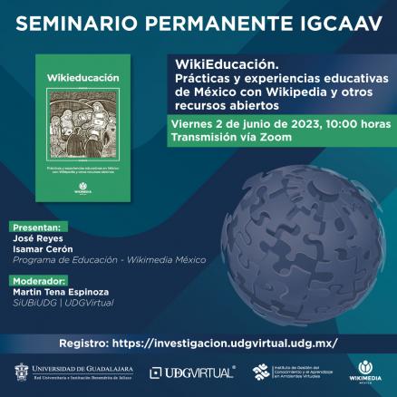 Únete a conferencia: Prácticas y experiencias educativas de México con Wikipedia y otros recursos abiertos Presentan: José Reyes y Isamar Cerón del Programa de Educación - Wikimedia México Viernes 2 de junio, 10:00 horas Vía Zoom, registro: https://investigacion.udgvirtual.udg.mx/