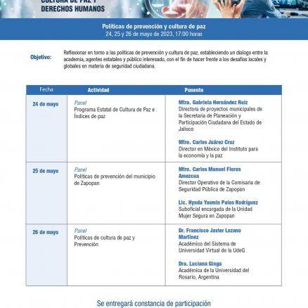 Te invitamos a participar en el Seminario de Seguridad Ciudadana, Cultura de Paz y Derechos Humanos "Políticas de prevención y cultura de paz" 24, 25 y 26 de mayo de 2023, 17:00 horas Se entregará constancia de participación Transmisión vía YouTube UDGVirtual