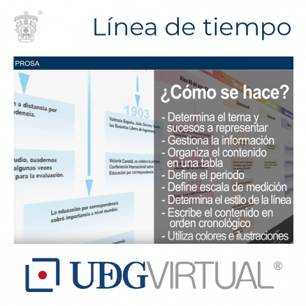 Una línea de tiempo permite organizar una sucesión de eventos de manera gráfica, con el fin de que su memorización y análisis resulten más sencillos al establecer claramente relaciones conceptuales. En esta página de UDGVirtual podrás encontrar un video tutorial y una guía escrita sobre cómo elaborar esta herramienta de aprendizaje paso a paso.