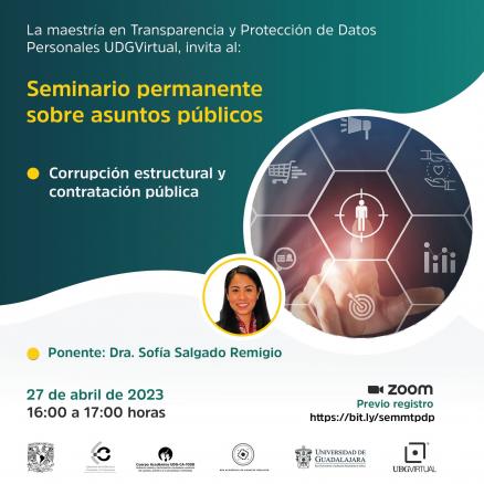 La Maestría en Transparencia y Protección de Datos Personales UDGVirtual invita a la conferencia: Corrupción estructural y contratación pública, impartida por la Dra. Sofía Salgado Remigio 27 de abril, 16 horas Síguela vía Zoom, previo registro: https://bit.ly/semmtpdp