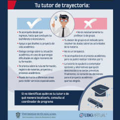 Durante tu trayectoria escolar, serás acompañado por un tutor, cuya misión será brindarte orientación a fin de que logres diseñar tu proyecto de vida académico, así como definir la ruta que se adapte mejor a tus necesidades y objetivos. En esta infografía de UDGVirtual, encontrarás información más detallada sobre las áreas en las que puede apoyarte un tutor de trayectoria.