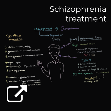 Video con duración de 6 minutos en el que se explica cómo funcionan los medicamentos de primera y segunda generación para el manejo de la esquizofrenia, su grado de efectividad y sus efectos secundarios. Asimismo, se describen las etapas de dicha enfermedad, sus síntomas y los tratamientos complementarios acorde a cada una.