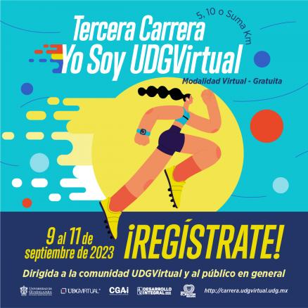 ¡Llegó el momento! Ya puedes inscribirte a la tercera #CarreraYoSoyUDGVirtual 5, 10 o Suma KM Gratuita Abierta al público en general Tendremos 1,000 paquetes: playera, medalla y artículo conmemorativo Consulta la convocatoria http://carrera.udgvirtual.udg.mx/